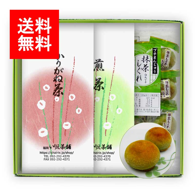 新茶ギフト#67 上かりがね茶 特上八女茶 プチまんじゅう[抹茶しぐれ] セット 90g 100g メール